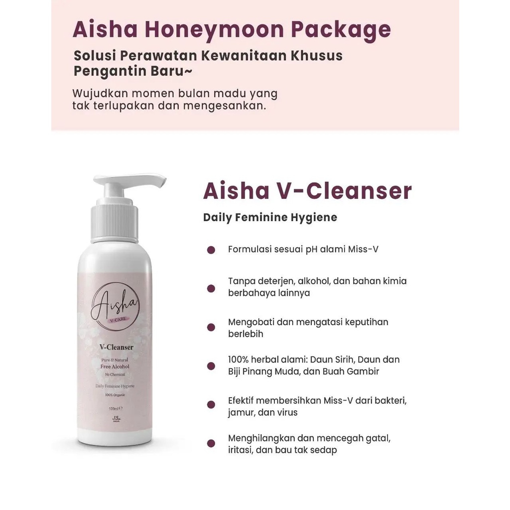 Ingredients/Bahan Baku: Aisha Honeymoon Package diperkaya dengan 100% herbal: Air, Daun dan Biji Pinang Muda, Daun Sirih, Buah Gambir, Misk Thaharah, Ekstrak Bunga, Vanilla, White Musk, Beras, Susu, Buah Pinang, Kayu Manis, White Oil, Jojoba Oil, Coconut Oil, Zaitun Oil, Akar Wangi, Petal Rose bud, dan Jasmine EO.