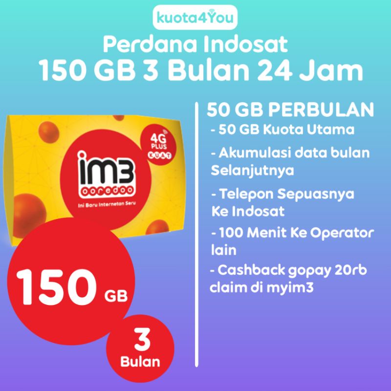 ☑️ Rincian Kuota Perbulan - 50 GB Kuota Utama - Gratis telpon 50 menit ke semua operator - Gratis telpon & sms sepuasnya ke indosat dan Tri 50 GB Bulan ke 1 50 GB Bulan ke 2 50 GB Bulan ke 3