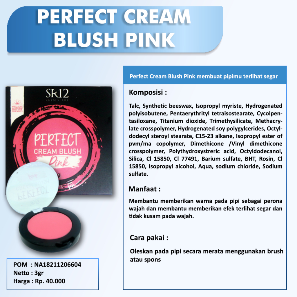Detail produk dari Perfect Cream Blush SR12 Pemerah bibi warna pink dan peach perona pipi Kandungan utama dalam Perfect Cream Blush SR12 - Colour, Talc, Titanium, Soybean Oil (melembabkan) Kelebihan SR12 Perfect Cream Blush On ? a. Membuat look make-up Nampak natural dengan varian warna menarik b. Membantu melindungi wajah dari pengaruh buruk sinar matahari c. Membantu menutupi noda hitam dan jerawat d. Tidak terlihat “cakey” saat pengaplikasian karena blush terserap merata pada wajah e. Memberikan tampilan yang fresh pada wajah f. Mengandung antioksidan untuk kulit wajah g. Blush On bertekstur creamy sehingga mudah diaplikasikan dan diratakan h. Pigmented, Awet dan tahan lama Tersedia 2 shade yakni Pink dan Peach (tergantung kesukaan / kecocokan) -Aman digunakan bumil dan busui -Bisa digunakan untuk semua jenis kulit Dapat Digunakan bersama rangkaian decorative SR12 lainnya (Perfect Cushion, Eye brow, Daily cover, All varian lip treatment SR12) Untuk pemakaian Blush On SR12 cukup tahan lama 6-8 jam namun tidak klaim waterproof pada kemasan ya seiring pemakaian dan aktivitas pengeluaran kelenjar keringan akan berkurang