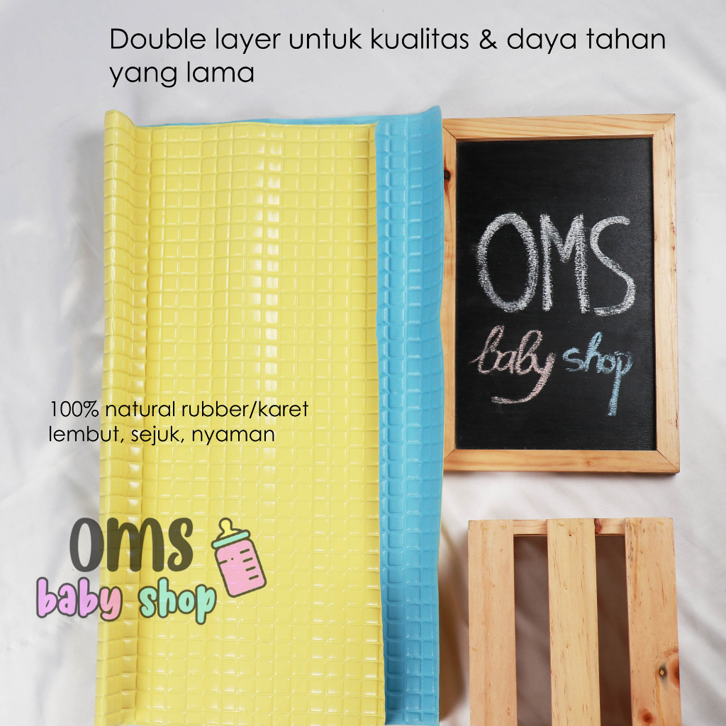 FITUR PRODUK: (1) Terbuat dari 100% karet alami (100% natural rubber) (2) Waterproof (tidak tembus air) (3) Double layered (2 lapis) sehingga lebih tebal dan tidak mudah sobek (4) Lebih lembut, dingin, dan nyaman digunakan bayi (5) Didesign dengan air-filled bubbles sehingga lebih empuk dan menyediakan cool cushioning pada bayi (6) Kedua sisi waterproof sehingga bisa dibolak-balik sesuai selera (7) Warna 2 tone (sisi dalam punya warna berbeda) (8) Dapat digunakan sejak lahir / newborn (9) Dapat digunakan sebagai alas ganti baju setelah mandi, sebagai alas toilet training di atas kasur agar melatih anak untuk tidak mengompol, alas mengganti popok, dsb.