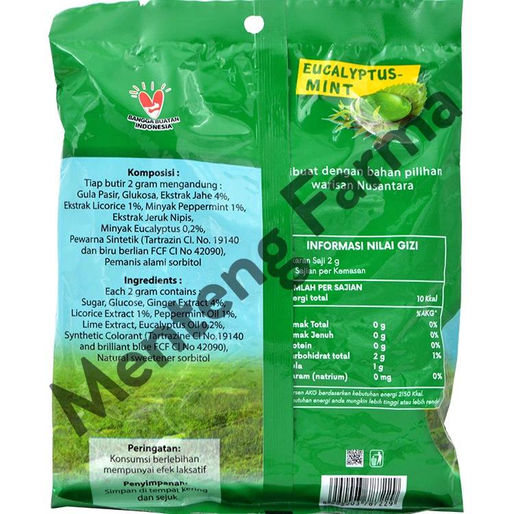 Komposisi : Gula pasir, Glukosa, Ekstrak Jahe 4%, Ekstrak Licorice 1%, Minyak Eucalyptus 1%, Ekstrak Jeruk Nipis, Pewarna Sintetik (Tartrazin CI No.19140 dan biru brilian FCF CI No 42090), Pemanis alami Sorbitol