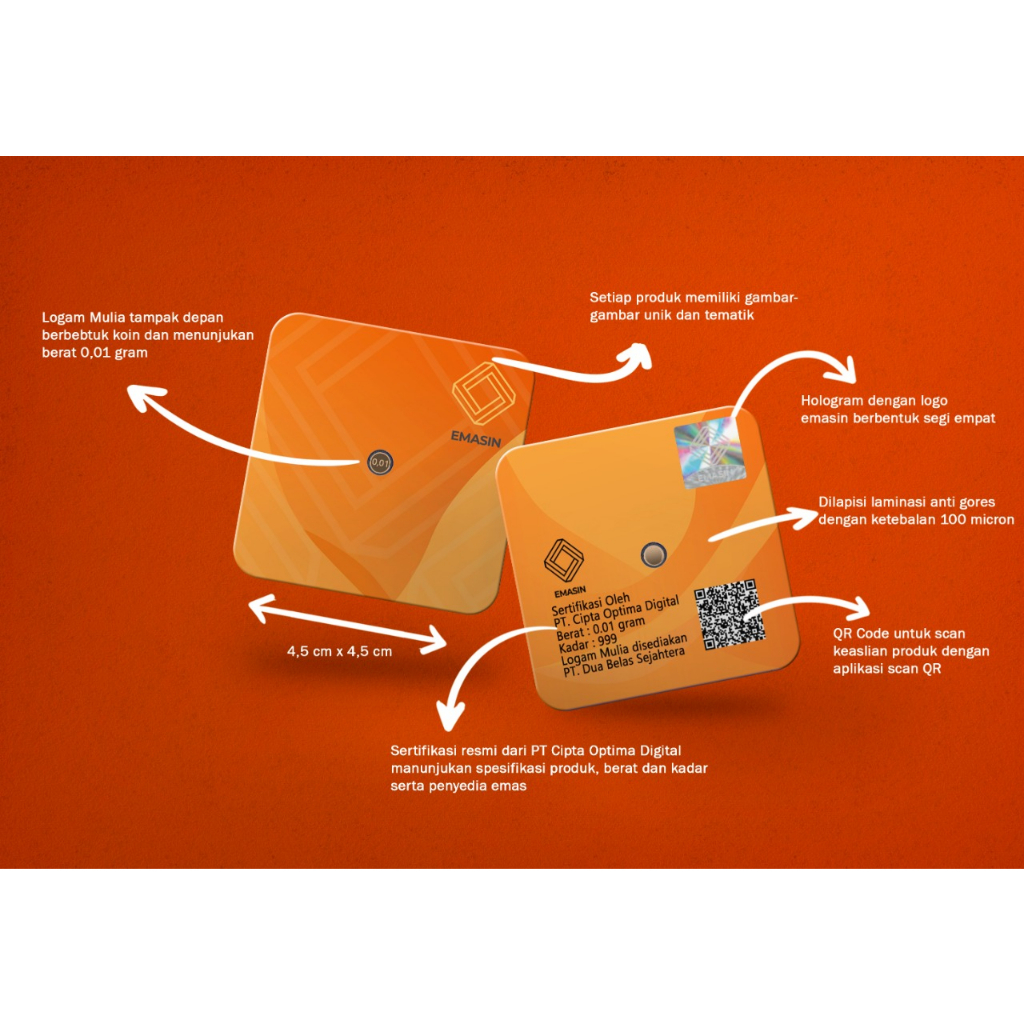 Logam mulia 24K 99.9% bersertifikat PT. CIPTA OPTIMA DIGITAL perusahaan yang sudah mengantongi sertifikat dari sucofindo untuk setiap emas yang diproduksi dengan kadar 24K kemurnian 999. Logam mulia cocok untuk investasi jangka panjang dengan jaminan harga yang cenderung naik setiap tahunya. LM ini cocok untuk souvenir perusahaan, hadiah pernikahan, angapao dan special gift.
