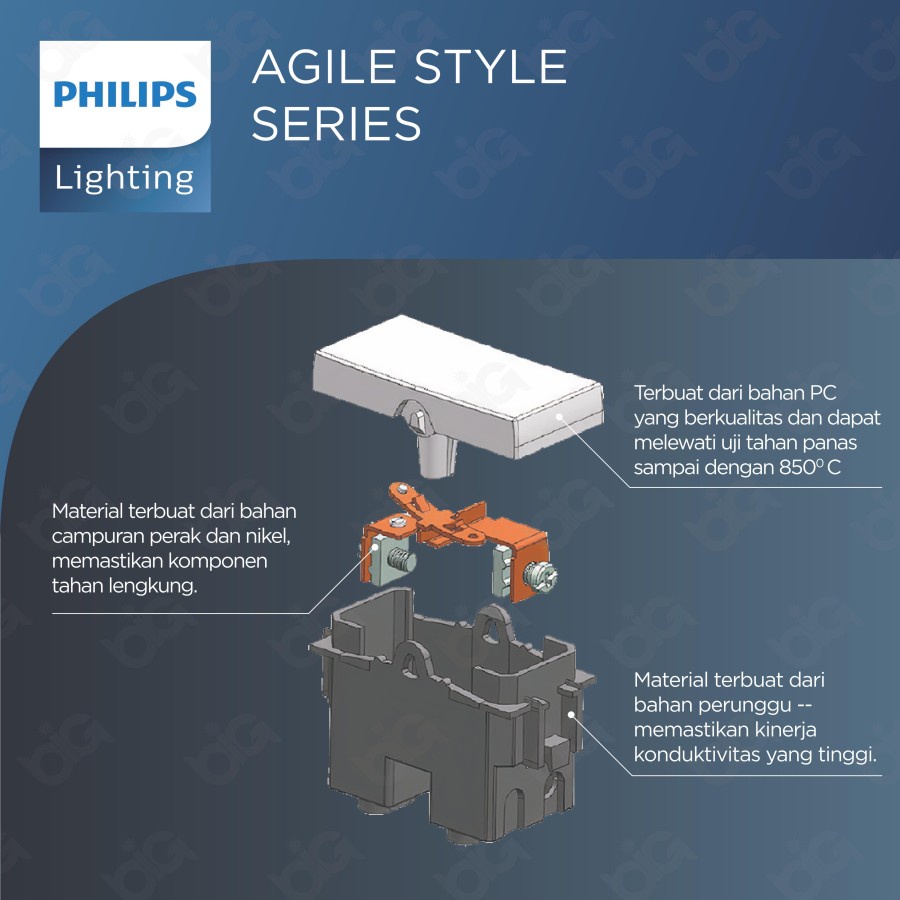 Saklar 2 Modular 1 Arah Seri AgileStyle -- 1 Dus Inner = 24 pcs -- Tipe: AGL2M1WSW 10AX 250V Standar IEC Sertifikasi SNI Masa pemakaian 40.000 kali Material PC, warna tidak berubah setelah beberapa tahun Philips seri AgileStyle desain modular dengan menggunakan bahan material PC yang tahan lama, flaksibel, mudah dipasang dan aman