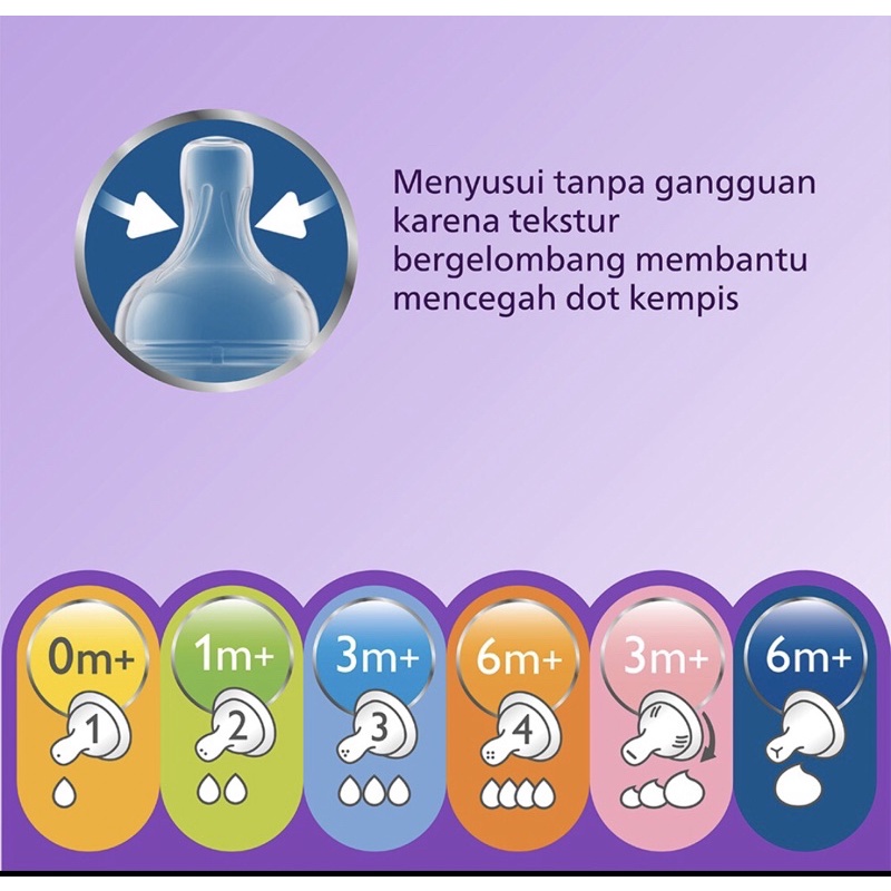 Tekstur bergelombang mencegah kempis untuk menyusui berkelanjutan Bentuk dot menjadikannya pas menempel pada mulut bayi dan tekstur bergelombang membantu mencegah dot kempis untuk menyusui berkelanjutan yang nyaman.