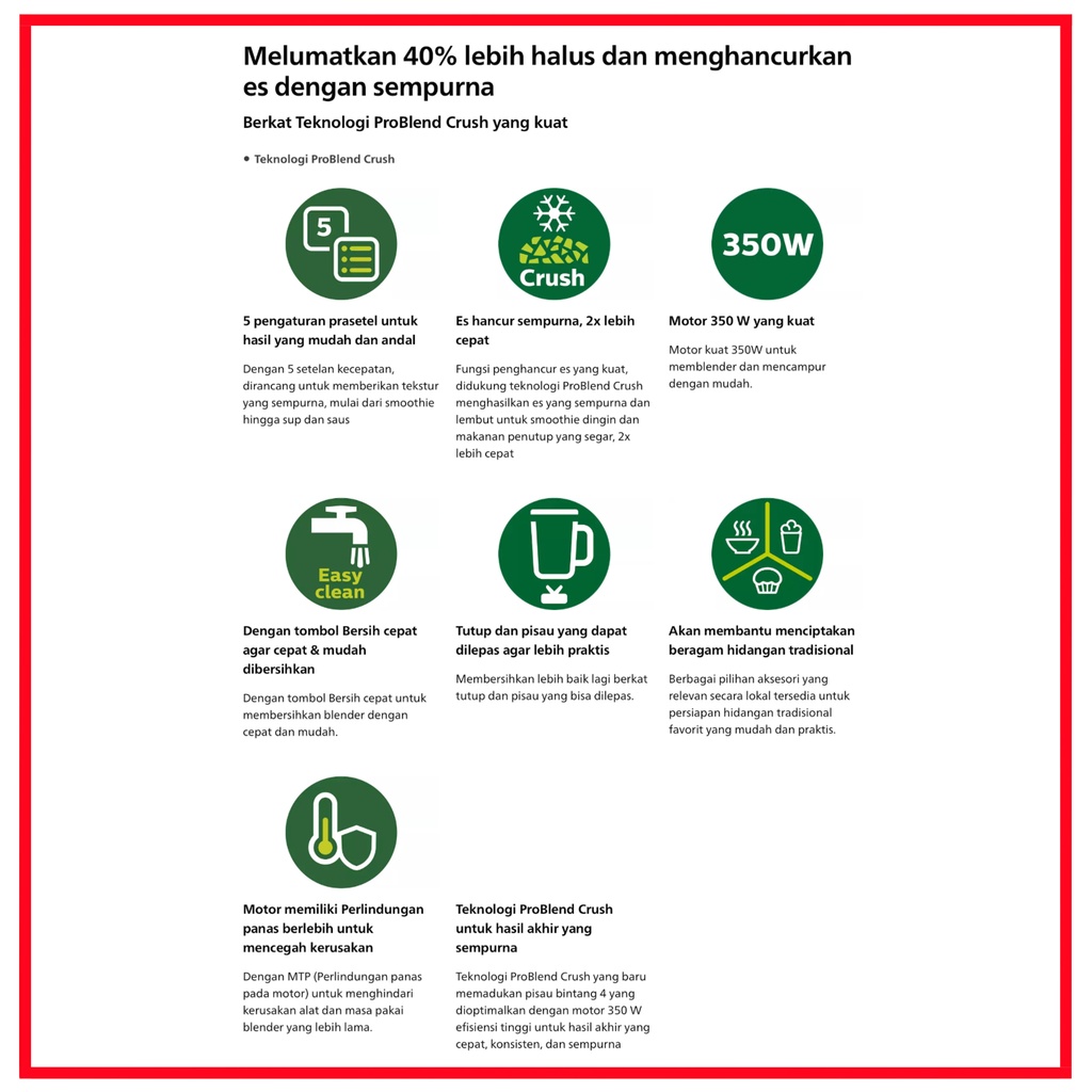 PHILIPS HR2222 Blender Series 5000 [2 L/ 350 W] Hadir dengan Teknologi Mutakhir yang Mampu Memblender Secara Halus Philips HR2222 Blender Series 5000 hadir sebagai blender terbaru keluaran Philips yang mempunyai teknologi ProBlend Crush. Kemampuan teknologi tersebut mampu menghancurkan es yang kuat sehingga menghasilkan es yang sempurna dan halus. Bahkan, teknologi ProBlend Cursh yang memadukan pisau bintang 4 yang dioptimalkan dengan motor 350W memberikan efesiensi yang tinggi untuk hasil akhir yang cepat, konsisten dan stabil. Disisi lain, mesin yang dihadirkan Philips HR2222/30 telah memiliki perlindungan panas yang berlebih untuk menghindari kerusakan pada mesin blender sehingga membuatnyan tahan lama untuk di pakai.