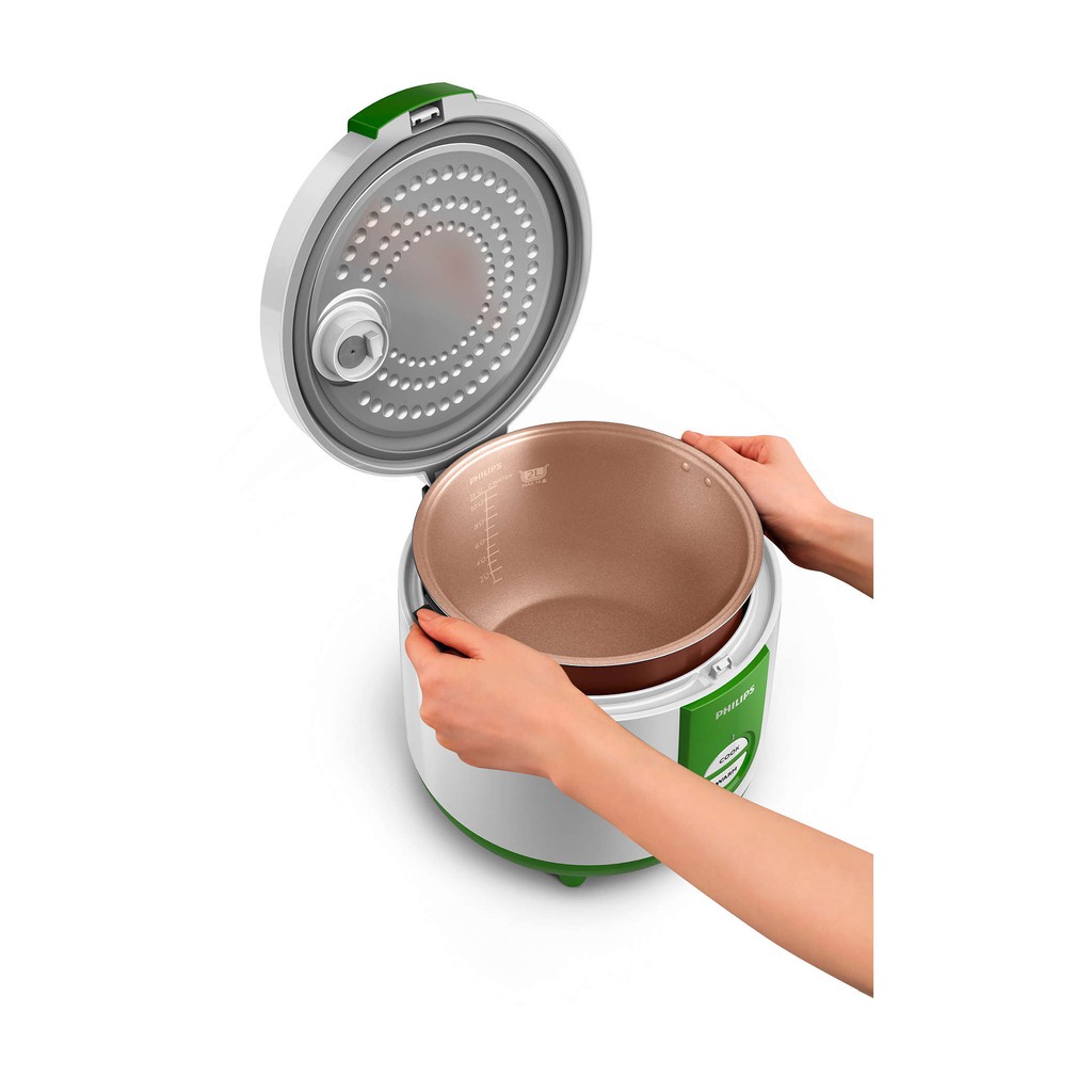 Nasi yang Nikmat untuk Anda dan Keluarga Philips Daily Collection Rice Cooker menghadirkan panci yang didesain dengan lima lapisan berbeda. Lapisan luar berbahan tembaga untuk dapat menahan panas sehingga nasi pun dapat tetap hangat dan segar. Kemudian terdapat pula resin protektif yang dapat melindungi bahan logam untuk membuat panci menjadi jauh lebih kuat. Lapisan selanjutnya adalah logam tebal yang dapat menghantarkan panas dengan baik sehingga semua butir beras dapat termasak merata. Hal tersebut juga didukung oleh lapisan dasar kuning keemasan yang dapat menyebarkan panas dengan lebih merata supaya nasi yang dimasak menjadi lebih pulen. Lapisan terakhir adalah pelapis kristal yang sangat keras yang tak hanya membuat panci tersebut anti lengket namun juga anti gores sehingga lebih mudah untuk dibersihkan dan tahan lama.