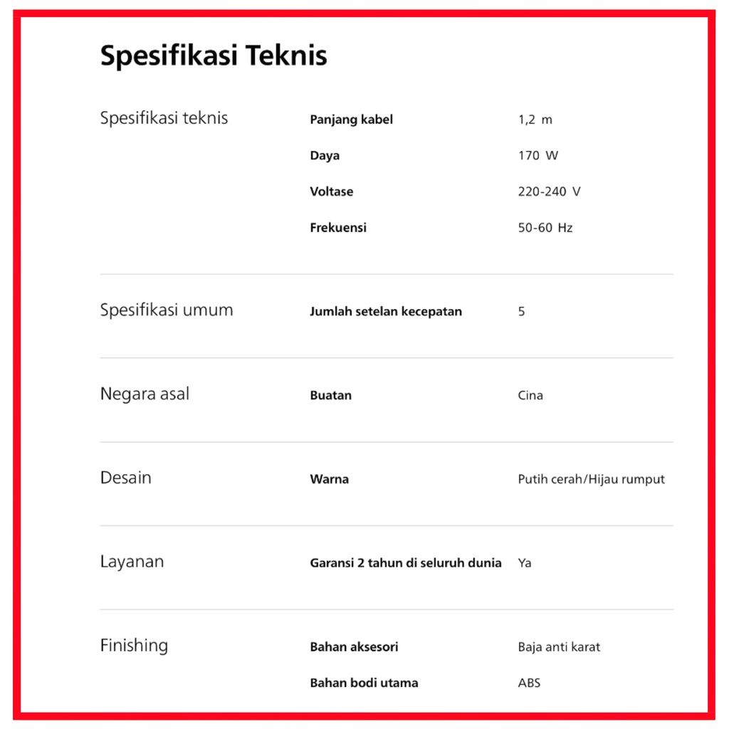 Fungsi : Hand Mixer Daya : 170W Jumlah setelan kecepatan : 5 Panjang kabel : 1.2 m Material : ABS (atas) Kelengkapan Paket : Unit, Kartu Garansi, Buku Manual Lain-lain