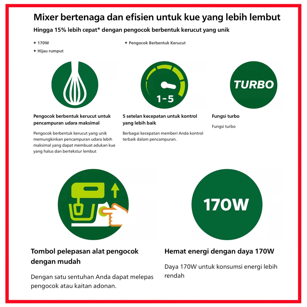 PHILIPS HR1552 Hand Mixer PHILIPS HR1552 Hand Mixer - White Red adalah hand mixer dengan pengocok berbentuk kerucut yang unik, memungkinkan pencampuran udara lebih maksimal yang dapat membuat adukan kue yang halus dan bertekstur lembut. Dilengkapi dengan berbagai kecepatan untuk memberikan Anda kontrol terbaik dalam pencampuran. Dengan satu sentuhan Anda dapat melepas pengocok atau kaitan adonan. Hand mixer ini memiliki konsumsi daya energi lebih rendah yaitu 170W. * Tipe Produk : Hand Mixer * Material : Bahan aksesori Baja anti karat Bahan bodi utama : ABS * Lain-lain : Voltase 220-240 volt Panjang kabel 1,2 m Frekuensi 50-60 Hz Jumlah setelan kecepatan 5