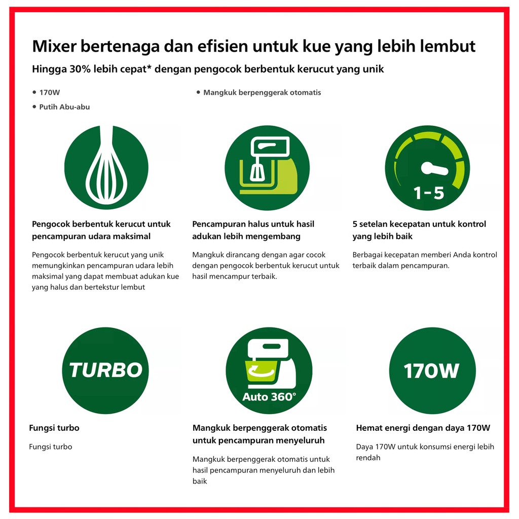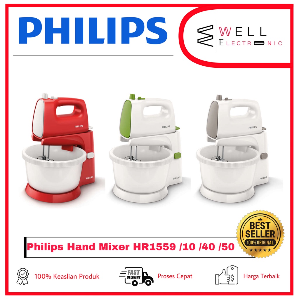 PHILIPS HR1559 Standing Mixer Membuat Kue Menjadi Lebih Mudah Bagi Anda yang gemar membuat kue, pasti sudah tidak asing dengan barang yang bernama mixer. Pada dasarnya, mixer berfungsi untuk mengaduk berbagai bahan yang dipakai untuk membuat kue. Dan seiring berkembangnya teknologi, mixer kini memiliki banyak fitur yang dapat memudahkan Anda saat membuat kue. Salah satu mixer yang memiliki banyak fitur adalah Philips HR-1559. Mixer besutan Philips ini termasuk mixer yang hemat energi. Pasalnya, Anda hanya butuh daya 170W untuk menggerakkan mixer. Pada pijakannya, disediakan juga kaki pengisap untuk hasil pencampuran yang optimal. Dengan adanya kaki pengisap ini, mixer mampu akan berdiri stabil saat melakukan proses pencampuran.