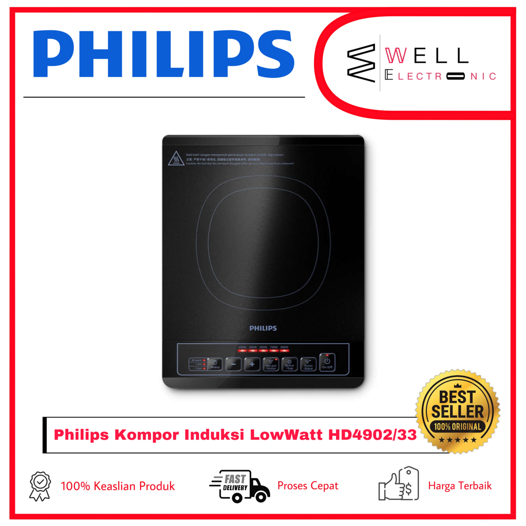 Philips Low Watt Induction Cooker HD4902/33 - Kompor Listrik - 800W Kemampuan memasak hebat, lebih banyak variasi. Daya 800 W memastikan pemanasan yang cepat dan efisien, dan pilihan menu lokalnya menyediakan berbagai pilihan untuk hidangan kontemporer. 5 power levels suitable for different cooking needs. Thanks to 800W high power, the Philips Induction cooker can ensure fast and efficient heating, which helps cookware bottom to reach high temperature in an instant. Overheating protection for safe cooking. Glossy glass plate is easy to clean.