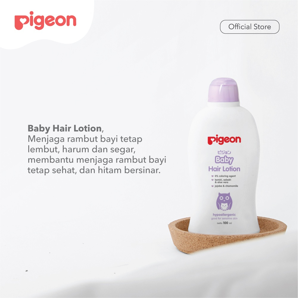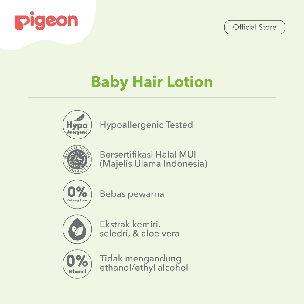 Keunggulan Pigeon Hair Lotion : 1. Hypoallergenic Tested 2. Halal : Tersertifikasi halal dari MUI (Majelis Ulama Indonesia) 3. Tidak mengandung pewarna : Tidak mengandung pewarna yang dapat menjadi pemicu alergi pada kulit bayi yang masih sensitif 4. Ekstrak seledri, kemiri & aloe vera 5. Tidak mengandung ethanol (ethyl alcohol)