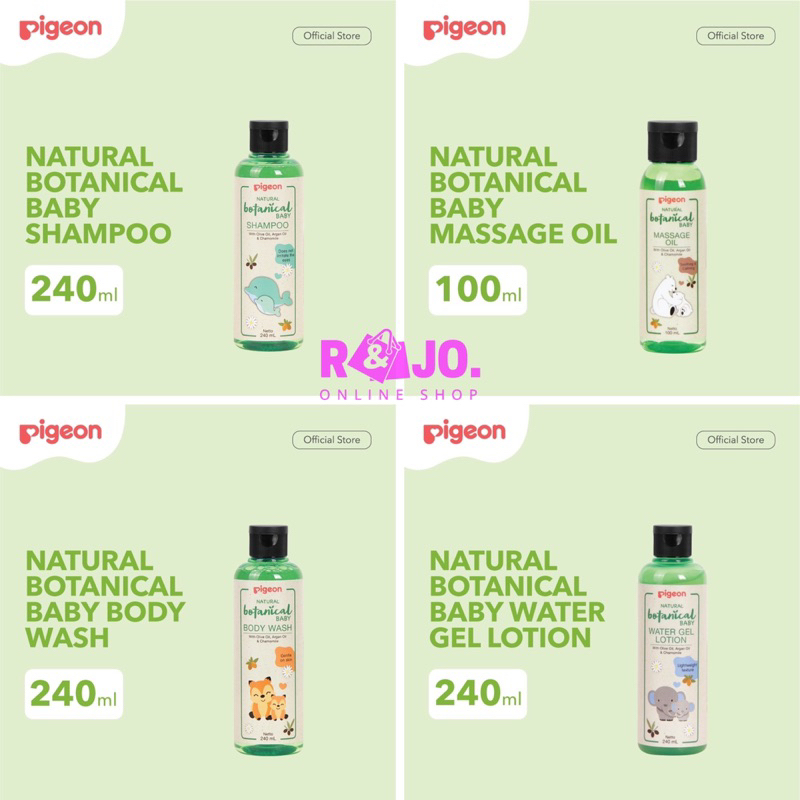 Pigeon Botanical Baby Body Wash 240 ml Diperkaya dengan bahan natural, membersihkan kulit halus bayi anda dengan lembut dan dapat tetap menjaga kelembapannya Dengan kandungan olive oil dan argan oil yang mengandung vitamin E, dapat melembutkan dan menjaga kulit tetap halus dan lembut. Selain itu mengandungekstrak chamomile yang membantu menjaga kulit bayi agar terhindar dari iritasi ringan. - Pigeon Botanical Baby Shampoo 240 ml Diperkaya dengan bahan natural yang lembut, efektif membersihkan rambut dan kulit kepala bayi sekaligus menjaga kelembapannya. Diperkaya dengan Olive Oil dan Argan Oil yang membantu menutrisi rambut dan kulit kepala bayi serta ekstrak bunga chamomile yang membantu melindungi kulit kepala bayi dari iritasi ringan. - Pigeon Botanical Baby Water Gel Lotion 240 ml Hadir dengan tekstur gel yang sangat ringan, mudah menyerap pada kulit bayi Anda serta memberikan kelembapan pada kulitnya - Pigeon Botanical Baby Massage Oil 100 ml Membantu menjaga kelembapan kulit bayi. Mudah diaplikasikan, direkomendasikan untuk penggunaan pijatan rutin setiap malam yang tidak hanya berguna untuk memperkuat ikatan antara ibu dan bayi tetapi juga dapat membantu menenangkan bayi sebelum tidur