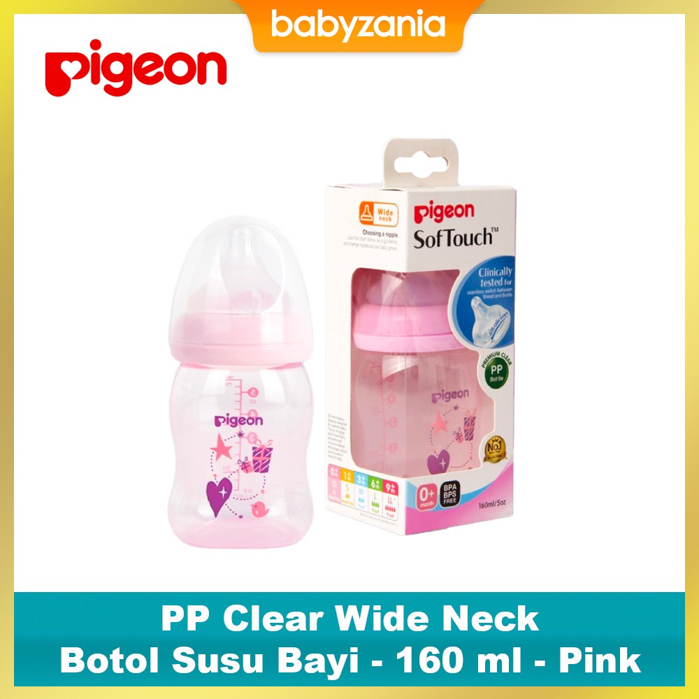 Pigeon Baby Bottle PP Clear Wide Neck merupakan botol susu yang dirancang untuk mengurangi udara tertelan. Sistem ventilasi baru untuk mencegah udara masuk sehingga menguraangi colic pada anak. Botol PP Pigeon terbuat dari bahan Polypropylene (PP) bening dan ringan, ideal untuk digunakan di dalam dan di luar ruangan. Soft Touch peristaltic plus sesuai untuk bayi menyusui , lembut dan elastis. Pigeon Baby Bottle PP Clear Wide Neck dilengkapi dengan dot ukuran SS yang dirancang untuk bayi baru lahir. Ukuran dot yang sesuai dan bahan silikon yang lembut dapat membantu bayi menghisap secara alami, bahkan pada bayi yang baru lahir.