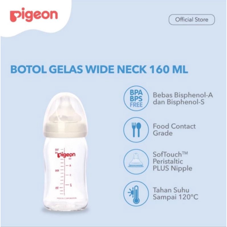 Pigeon Wide Neck Botol Susu with P-Plus Nipple merupakan botol susu berbahan kaca borosilicate (bebas BPA dan Food Contact Grade) yang tahan suhu panas hingga 120C. Botol dengan dot Softouch Peristaltic Plus ukuran SS untuk bayi baru lahir. Dilengkapi dengan buku intruksi yang dikemas dalam individual box desain baru berbahan Carton