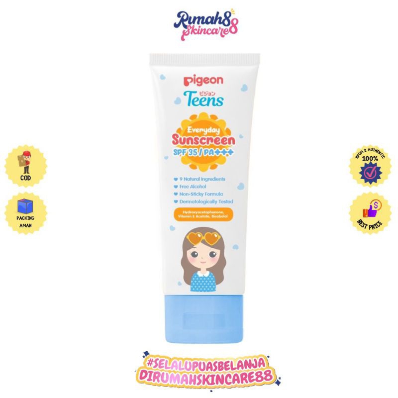 Pigeon Teens Everyday Sunscreen SPF 35/PA+++ bebas alcohol, telah teruji secara klinis cocok untuk kulit remaja maupun kulit sensitif. Formulanya ringan, tidak lengket, dan cepat meresap.