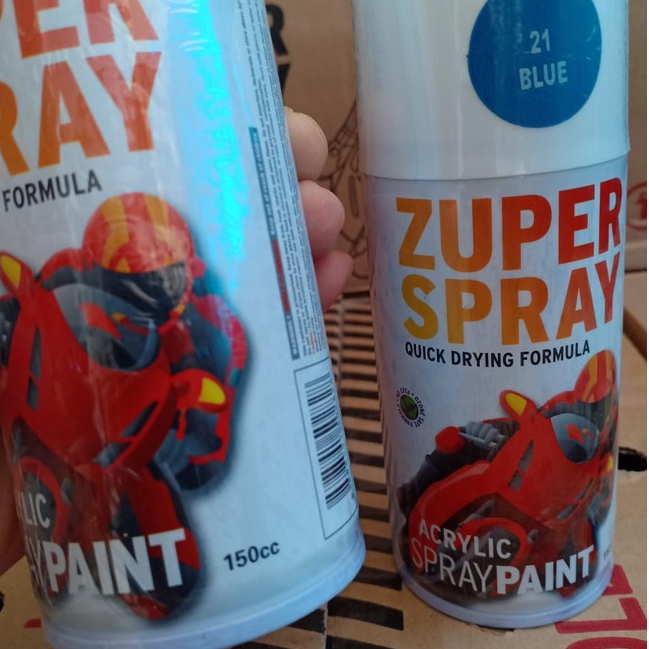 Cat Semprot Zuper Spray Paint merupakan cat semprot serbaguna, cepat kering, tahan bensin, tahan cuaca, lebih mengkilap dan tidak mudah retak, dapat juga dapat diaplikasikan pada lapisan besi, kayu dan plastik.