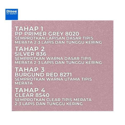 Dapatkan hasil maksimal dgn cara sbb: 1. Pastikan permukaan media yg akan disemprot sudah digosok halus dan bersih 2. Gunakan epoxy Diton Primer Grey 8020 (abu-abu) 3. Semprotkan Diton Burgund Red 8271 4. Gunakan Clear (8540 Untuk Hasil Gloss / 810 Untuk Hasil Doff)