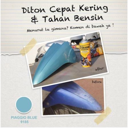 Dapatkan hasil maksimal dgn cara sbb: 1. Pastikan permukaan media sudah digosok halus dan bersih 2. Gunakan primer Diton Premium grey 9120 3. Semprotkan dasaran cat silver diton premium 9124 4. Semprotkan Diton Premium piaggio blue 9185 5. Gunakan Clear Diton Premium 9128 mengkilap atau Clear doff 9130 (sesuai selera Anda)