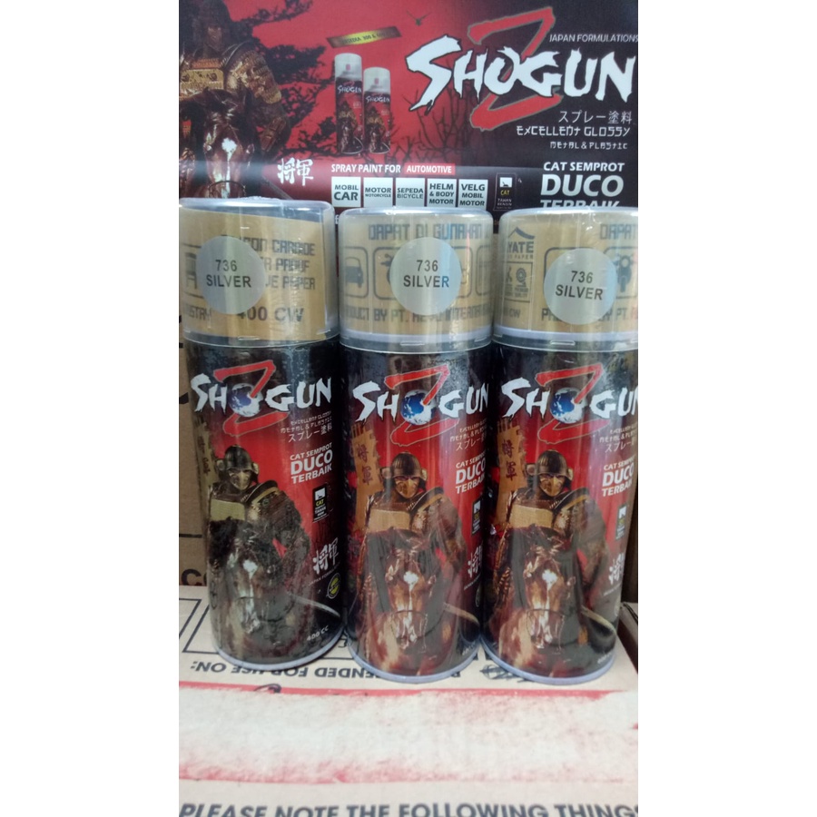 SHOGUN Z adalah cat semprot duco instan yang diformulasikan khusus sehingga tahan bensin,tidak retak, daya kilap tinggi, cepat kering dan lebih tahan lama,dapat digunakan untuk kebutuhan otomotif kendaraan roda dua dan empat baik juga untuk permukaan untuk interior maupun eksterior pada objek plastik, kayu dan metal