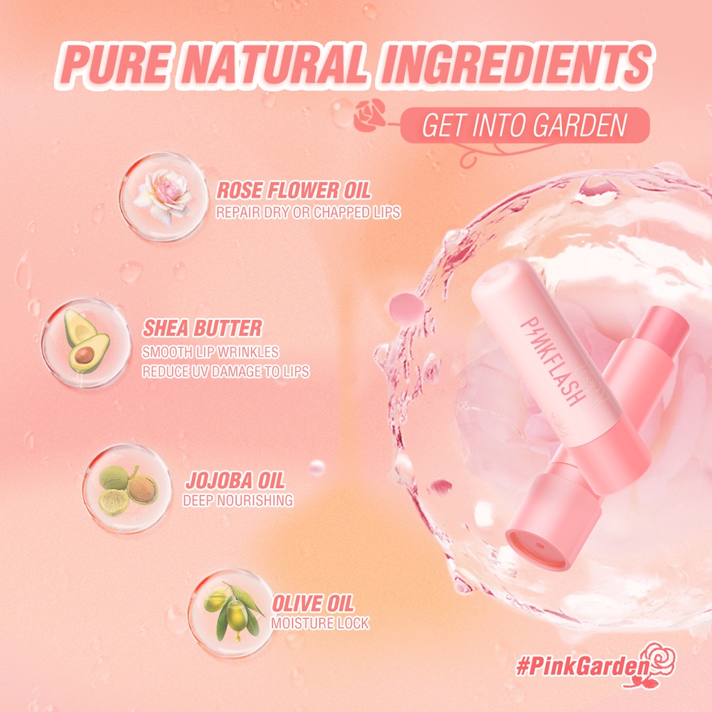 PINKFLASH #PinkGarden Plant Oil-Based Lasting Moist Lip Balm diformulasikan dengan minyak nabati alami sehingga dapat menutrisi serta memberikan bibir dengan kelembaban yang tahan lama.