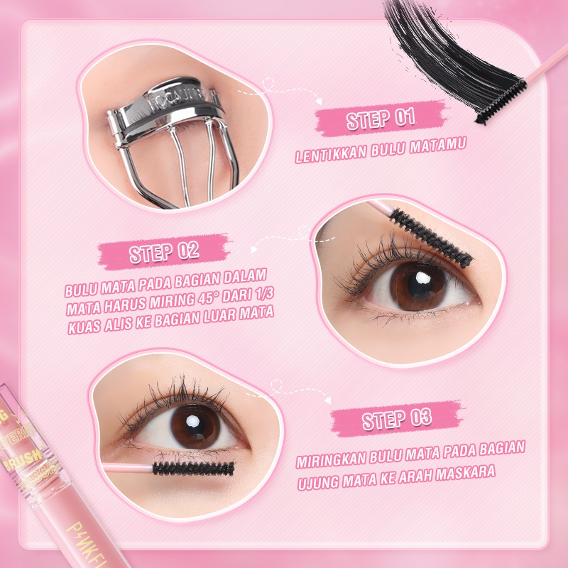Tips: 1. Gunakan sisi samping maskara untuk menghaluskan bulu mata dari akar bulu mata ke ujung bulu mata dan menggulung ke dalam. 2. Dapat digunakan dengan Pinkflash eyeliner untuk menghasilkan mata yang indah