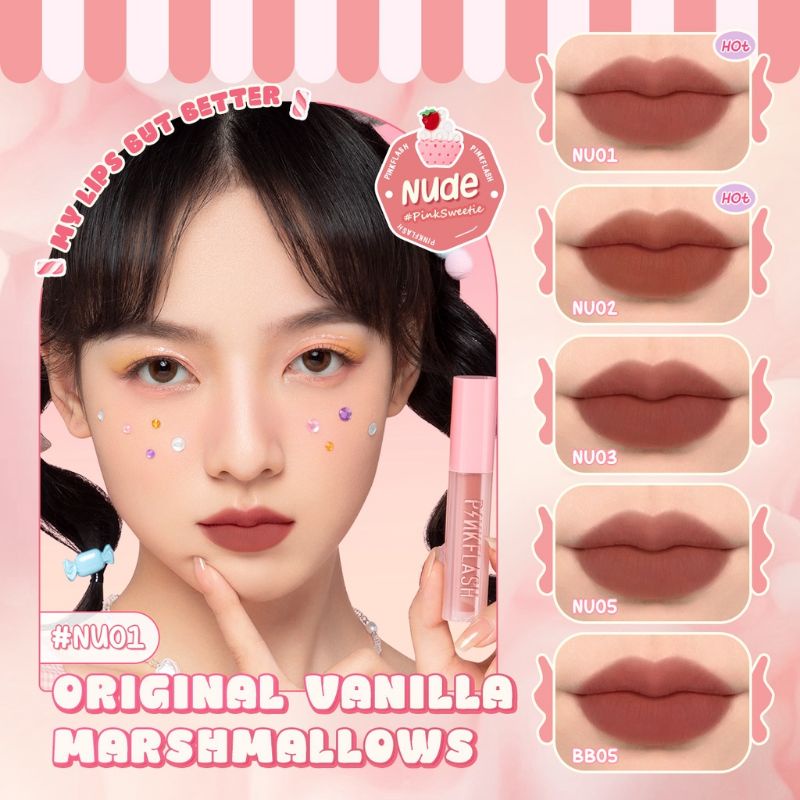 ❤ PINKFLASH #PinkSweetie Powdery Lip Gloss soft like marshmallow, more lightweight and more breathable, create a fuzzy velvet matte lips, always be own sweetie!