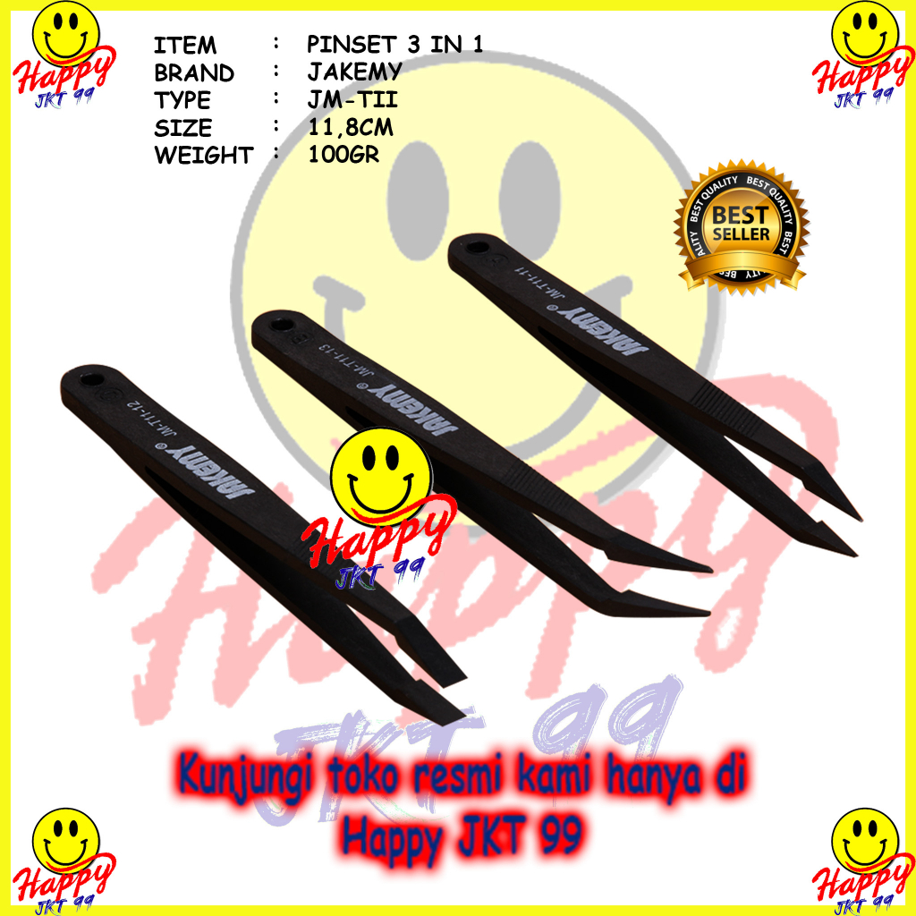 Tweezer Set Jakemy High Anti Static Tweezers Suit - JM-T11 memiliki 3 buah jenis tweezer seperti curve fin tip, flat tip dan fine tip yang masing-masing memiliki kegunaan tersendiri.