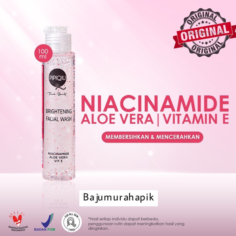 Pipiqiu Brightening Facial Wash + Niacinamide untuk kecerahan kulit sehingga bebas dari kuman. Diperkaya dengan Aloe Vera Extract untuk menyegarkan kulit dan Vitmine E sebagai moisturizer untuk memelihara kelembaban dan kelembutan.