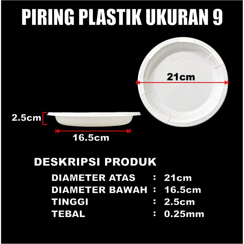Spesifikasi : Material HIPS Kaku P9 = Ukuran 9 Inch Uk Diameter luar 21 cm Uk Diameter bawah 16.5 cm Tinggi 2.5cm Tebal 0.25 mm Warna Putih