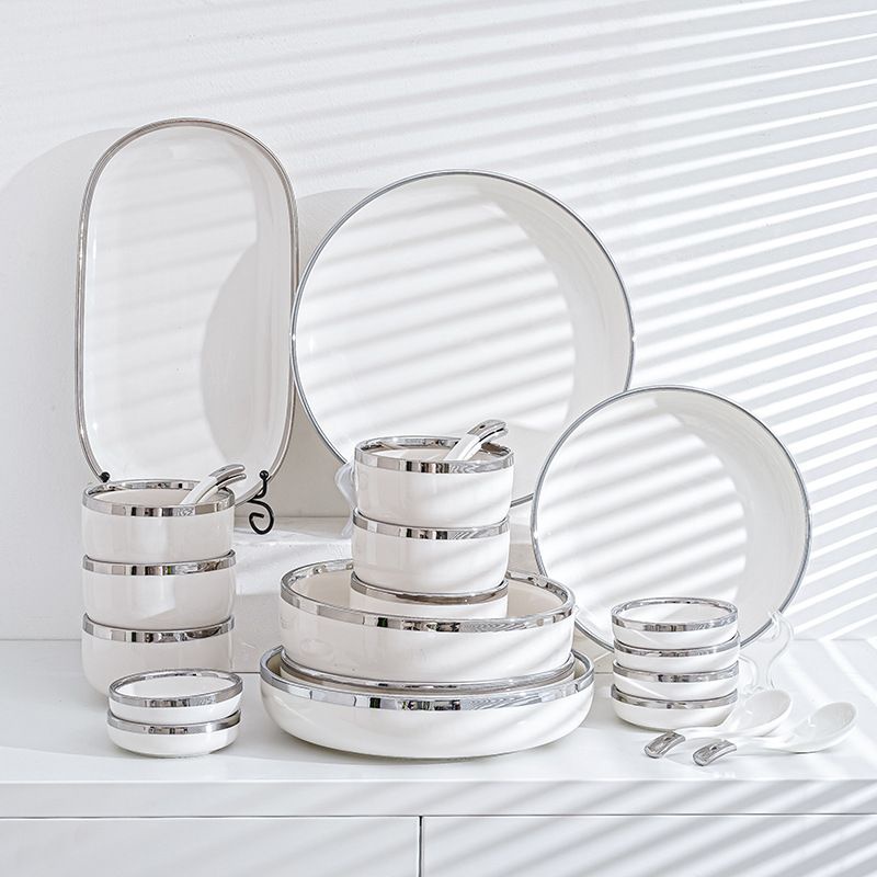 Detail Piring Set White Silver Dining Oriental Set 26 pcs free box