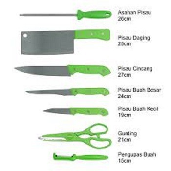 1x pisau daging 1x pisau cincang 1x pisau buah besar 1x pisau buah kecil 1x asahan pisau 1x pengupas buah 1x gunting 1x talenan Spesifikasi :