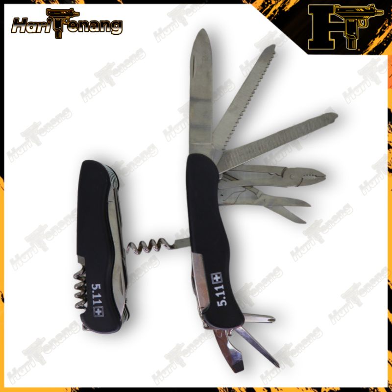 1 alat terdiri dari 11 macam fungsi -pisau -gergaji -tang mini -kikir mini -gunting -pembuka botol -pembuka botol besar -pembuka tutup kaleng -obeng (plus) kecil -obeng (plus) panjang -pengait tali
