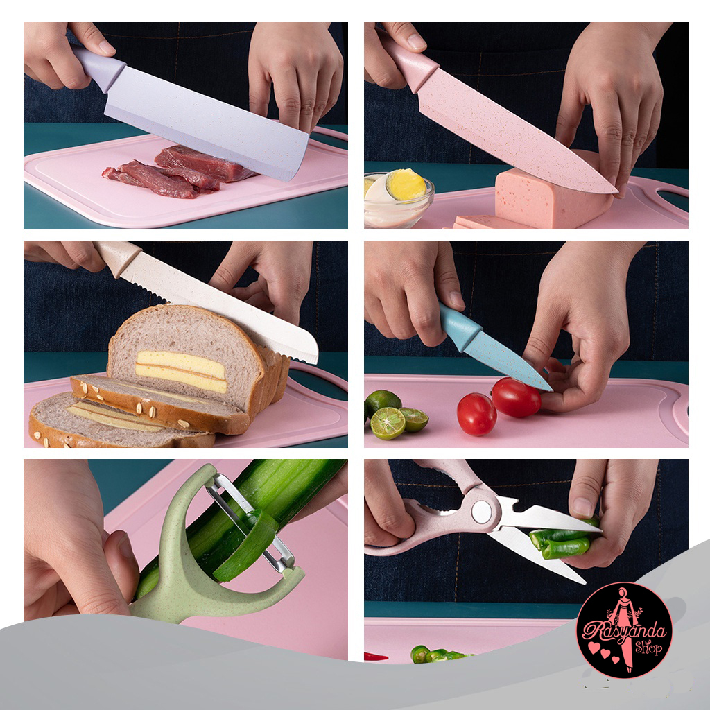 Set pisau serbaguna yang terbuat dari bahan stainless steel non stick coating Cocok untuk di gunakan di rumah tangga ataupun dijadikan hadiah untuk keluarga terdekat atau orang kesayangan anda. 1 set terdiri dari 6 pisau dengan warna kombinasi (tidak bisa pilih 1 warna karena sudah 1 set) dan 1 Serutan.