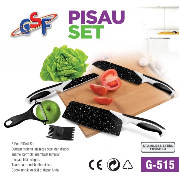 > 5pcs Knife Set ( Pisau Koki, 8" Pisau Roti, 8" Pisau Slice, 5" Pisau Utilitas, 3.5" Pisau Pengupas ) + 1 Pengupas Lapis Keramik. > Gagang dengan campuran batu maifan > Lapisan lapisan granit > Non Stick Coating Blade. > Dibuat untuk Koki Profesional. > Kemasan Kotak Cantik. > UKURAN PRODUK 32x17x4 cm