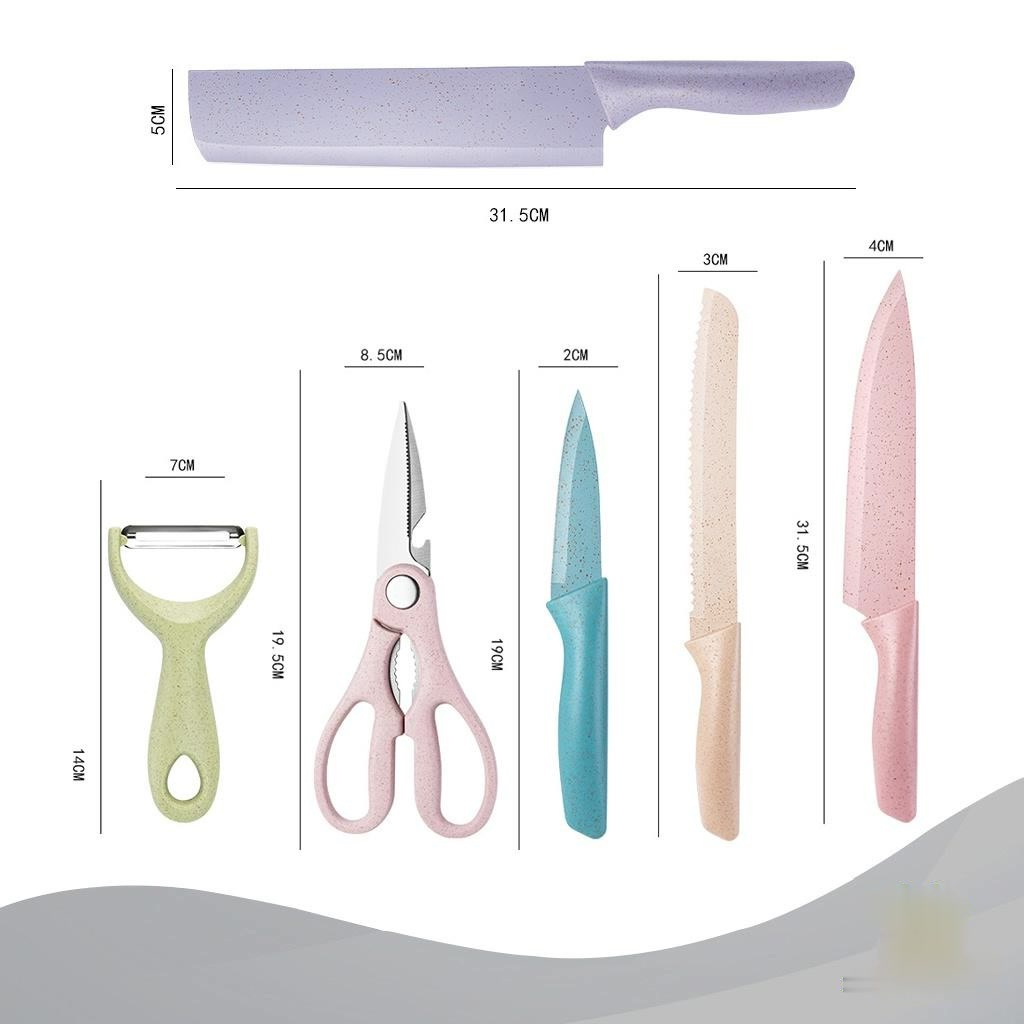 Fitur: - 1 set isi 6 pcs (TIDAK TERMASUK TALENAN) - Set dapur lengkap dengan kualitas premium - Dengan mata pisau berbahan dasar baja yang tajam - Lapisan anti lengket - Pegangan pisau yang tidak licin / anti slip dan ergonomis - Aman untuk bahan makanan dan lebih tajam