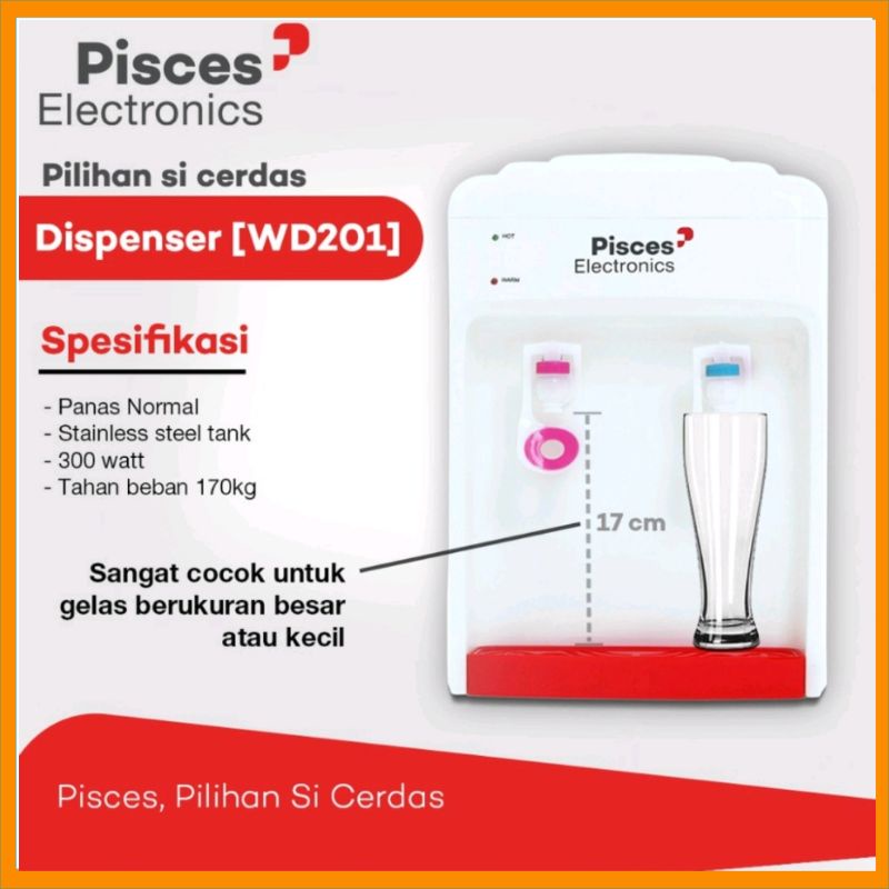 Spesifikasi: *Tipe Produk : Pisces WD-201 * Jenis : Dispenser * Warna : White Red * Tap Keran : 2 Keran (Panas+Normal) * Temperature : Menghasilkan air panas dengan suhu hingga 92c * Daya Pemanas : 300 watt * Dimensi Produk : 28x28x40 * Body Kokoh Tahan beban sampai 170 kg