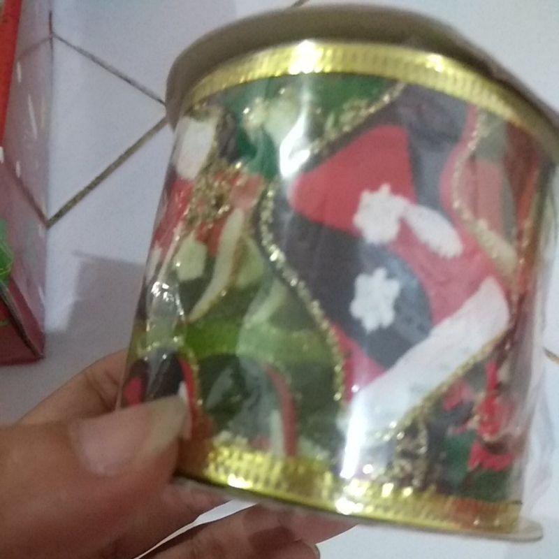sesuai foto dikirim motif random. ukuran 2inch dengan tepi kawat emas. pita transparan bermotif natal