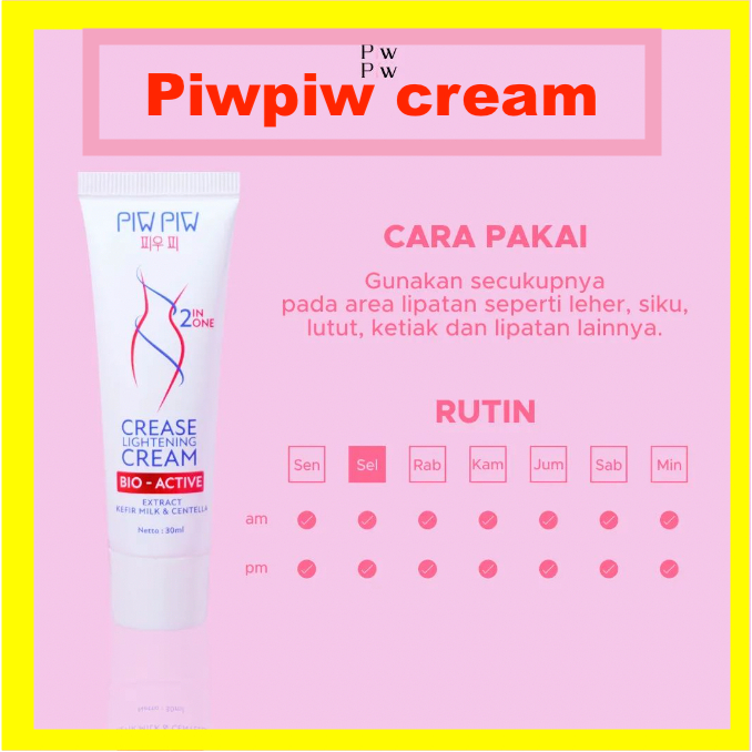 CARA PAKAI: Oleskan PIW PIW Crease Lightning Cream pada ketiak atau area lipatan seperti selangkangan dengan merata. Pakai secara rutin untuk mendapatkan hasil yang optimal.