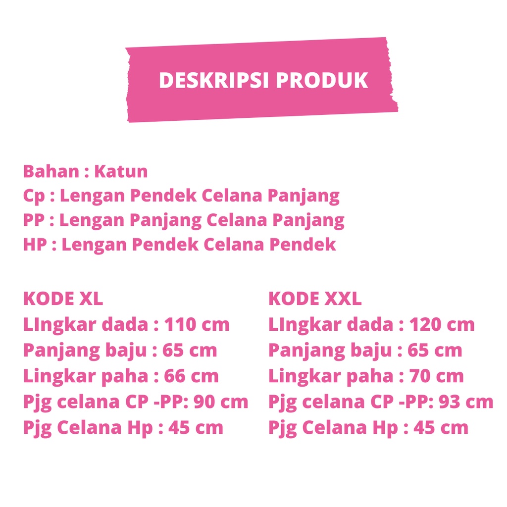 Label XXL Bahan Katun Lingkar dada 118-120 cm Panjang baju 65 cm Lingkar paha 68 cm panjang celana 90 cm (cp & pp) panjang celana 45 cm( HP) (dengan toleransi eror ± 2cm) bisa dipakai bb Max 81 kg