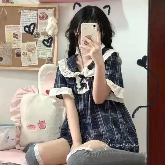 Fashion Bayi & Anak > Pakaian Anak Perempuan > Baju Tidur > Piyama baru Jepang lengan pendek boneka kerah renda renda renda bagian tipis putri angin dalam setel