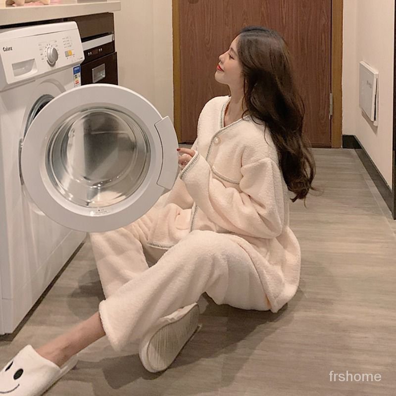 Piyama beludru karang tebal empuk wanita musim gugur dan musim dingin yang manis sedikit harum angin
