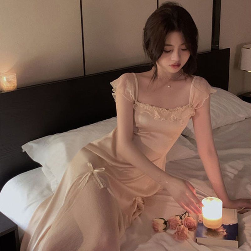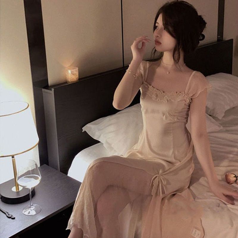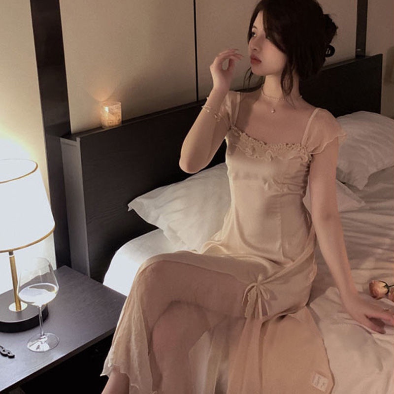 Pakaian Wanita > Pakaian Tidur & Piyama > Daster > Piyama dengan bantalan dada baju tidur sutra es sutra seksi renda peri Prancis renda keinginan murni