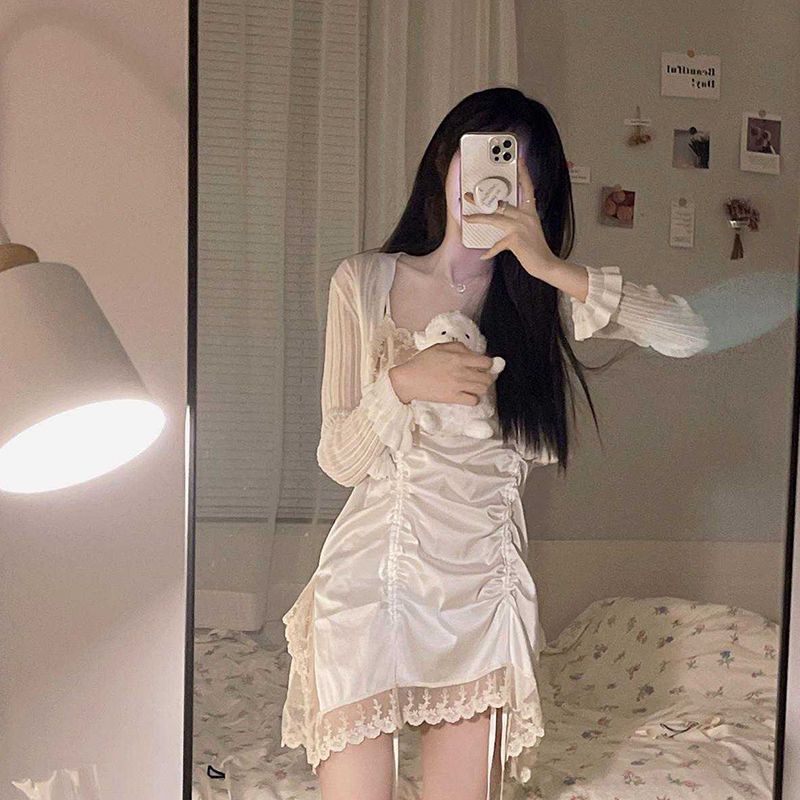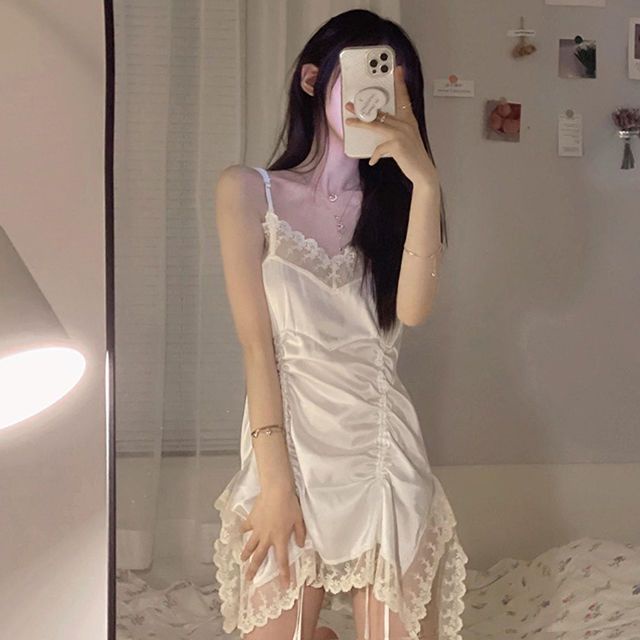 Detail Piyama halter Korea yang indah, piyama asrama mahasiswa renda tambal sulam satin, piyama serut satin