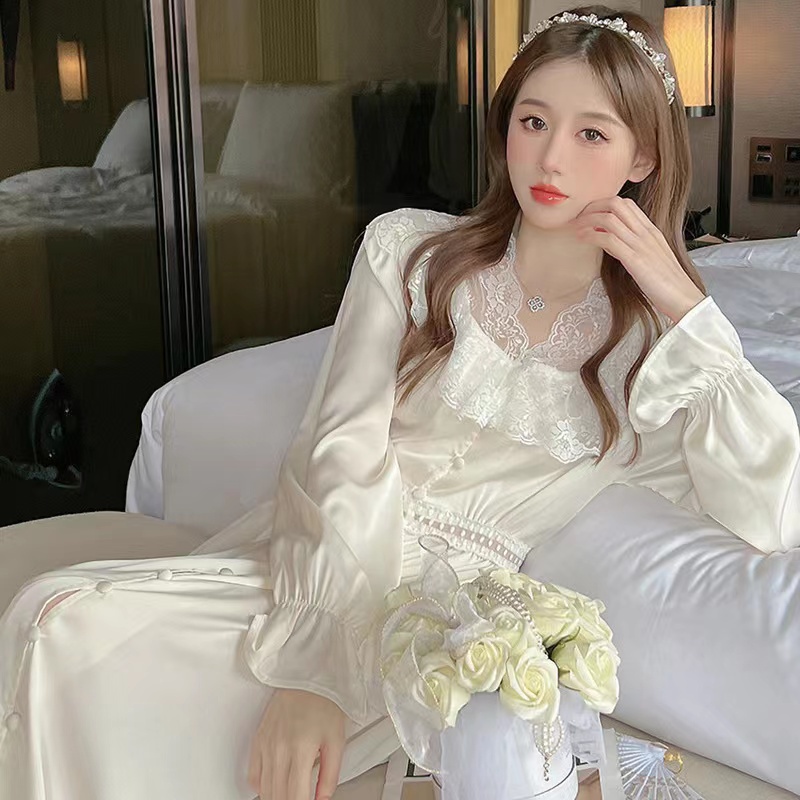 Detail Piyama Pengadilan Seksi Wanita Tipis Sutra Prancis Retro Retro Panjang -Gaun Malam Putri Lengan