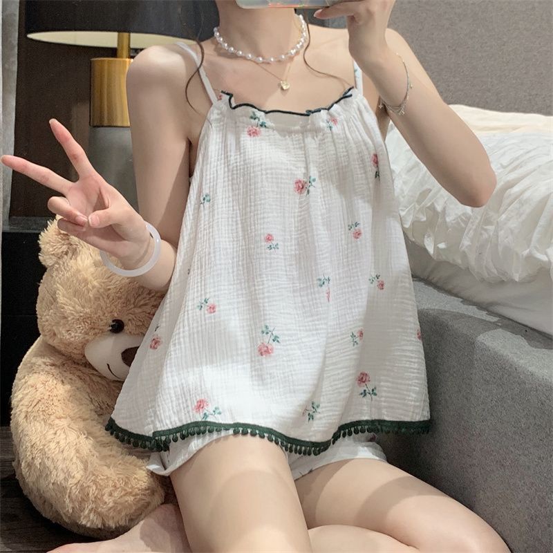 Detail Piyama wanita gaun halter bunga baru gaun halter bunga manis celana pendek seksi set pakaian rumah