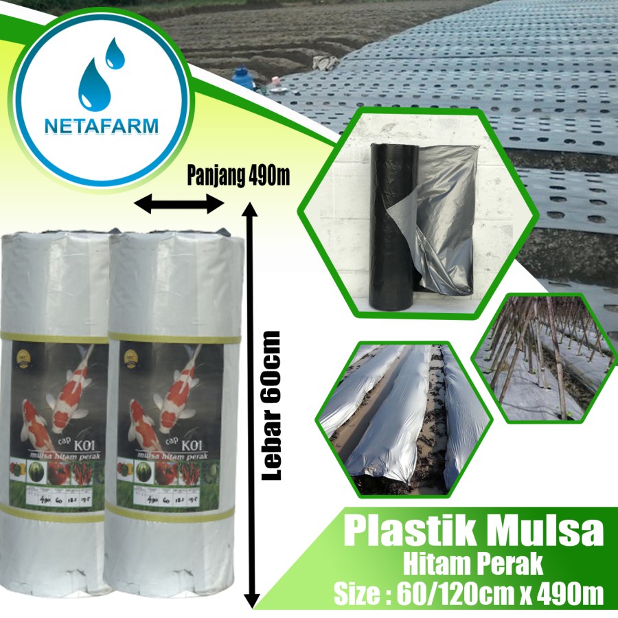 Jenis : Plastik Mulsa Merk : Cap Koi Warna : Hitam Silver Lebar : 60cm ( kalau dibuka lipatannya lebar 120cm ) Panjang : 490m Berat : -+18,5kg