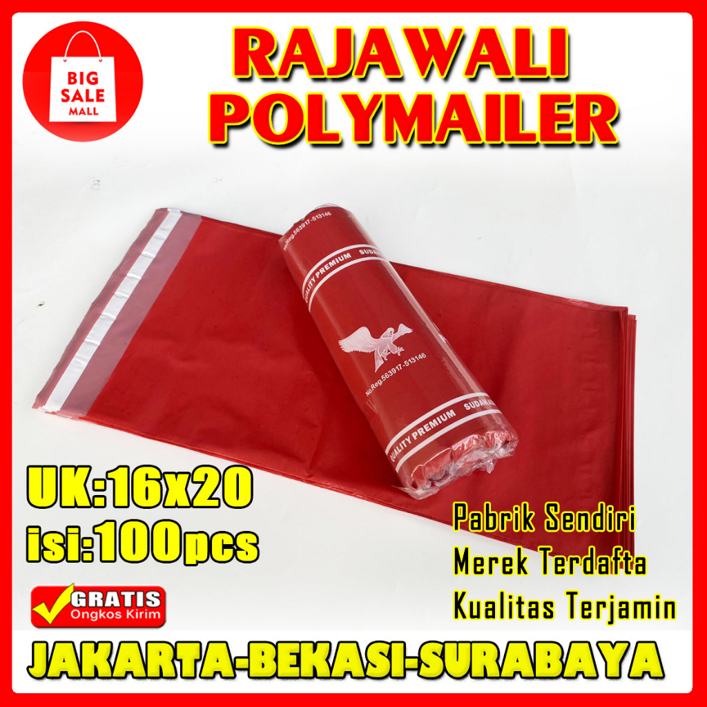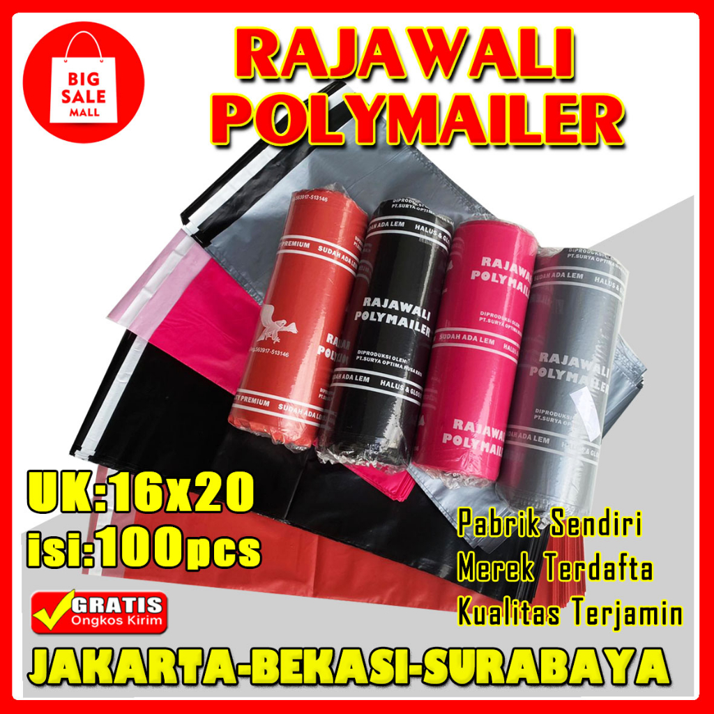 RAJAWALI POLYMAILER " KWALITAS KAMI TERBAIK" .Merek Terdaftar Kualitas terjamin. Spesifikasi produk: 16 x 20 = isi 100 bags 17 x 30 = isi 100 bags 20 x 30 = isi 100 bags 20 x 40 = isi 100 bags 25 x 40 = isi 100 bags 30 x 40 = isi 100 bags 35 x 50 = isi 100 bags 40 x 50 = isi 100 bags 40 x 60 = isi 100 bags 45 x 60 = isi 50 bags 50 x 60 = isi 100 bags 60 x 100 = isi 50 bags 60 micron
