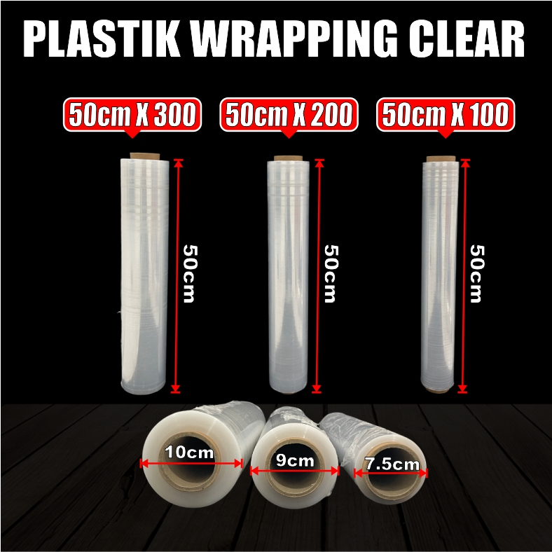 Spesifikasi : Warna strech film clear/bening Bahan lentur tidak mudah sobek Lebar 50cm Diameter roll 9cm Tebal plastik per roll 13.5mm Tebal karton roll 4.3mm