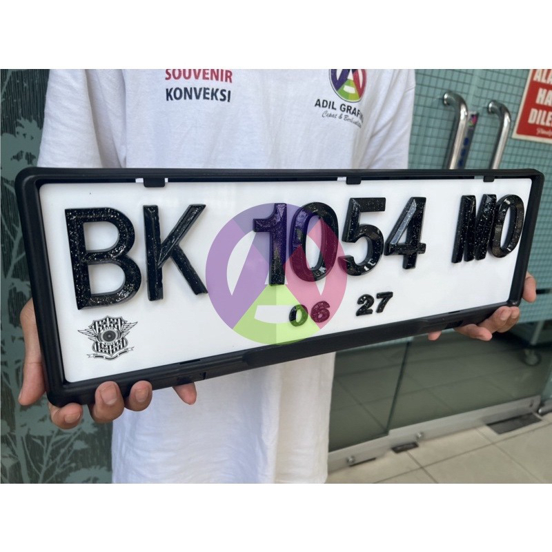 - Bahan terbuat dari F1800iber Hitam Gliter Segi 5 ukuran 7 cm - Huruf Lengkap Depan Belakang - Plat Akrilik Putih Ketebalan 2 mm sudah ada logonya - Nomor Tahun 2 cm - Free Bonus Sarang/Dudukan plat, untuk pemesanan 1 set.