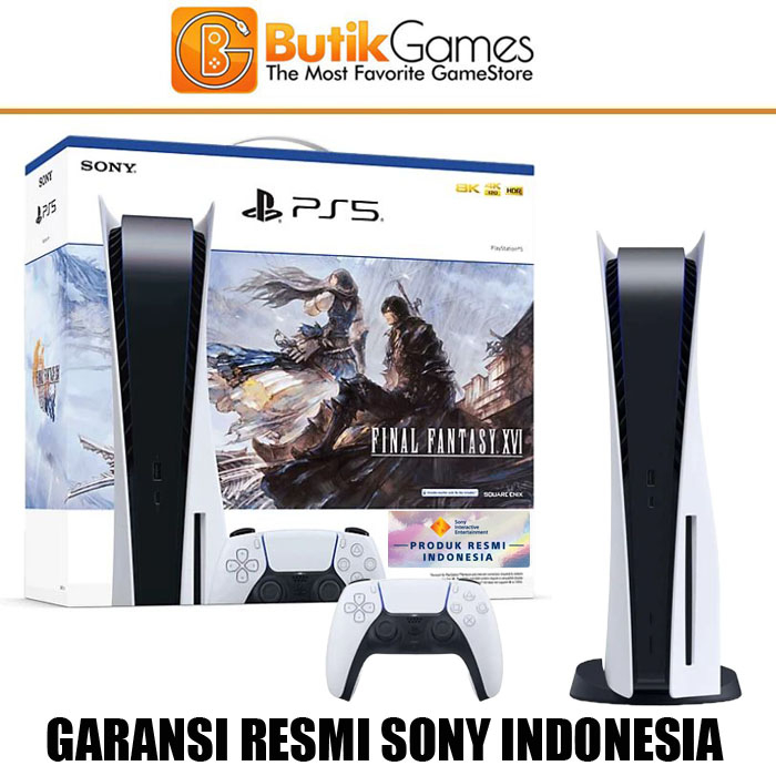 PS5 Console with Ultra HD Blue-ray™ disc drive x 1 DualSense Wireless Controller x 1 Base (Vertical Stand) x 1 HDMI™ cable x 1 AC power cord x 1 USB cable x 1 Printed materials x 1 Kartu Garansi x 1 ASTRO’s PLAYROOM (Pre-installed game) x 1 PS5 “Final Fantasy XVI” Redeem Code (English/Chinese/Korean) x 1 Digital content (DLC bonus) : - “Braveheart” Weapon - Gil-boost Accessory “Cait Sith Charm” - Exp-boost Accessory “Scholar's Spectacles”